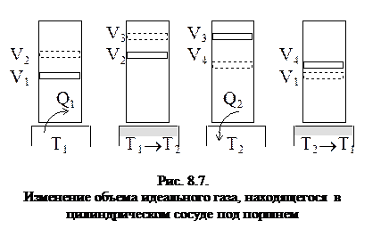 Анализируя работу тепловых двигателей, Карно пришел к выводу, что наивыгоднейшим процессом является обратимый круговой процесс, состоящий из двух изотерм и двух адиабат, так как он характеризуется наибольшим коэффициентом полезного действия. Такой цикл получил название цикла Карно. Цикл Карно – прямой круговой процесс, при котором выполненная системой работа максимальна. Пусть некоторая система может вступать в тепловой контакт с двумя тепловыми резервуарами, температуры которых Т1 и Т2, а теплоемкости бесконечно велики (то есть добавление или отнятие некоторого количество теплоты не изменяет температуры). Примем, что система представляет собой идеальный газ, находящийся в цилиндрическом сосуде под поршнем (рис. 8.7.). Считаем, что стенки и поршень теплонепроницаемы. Пусть сначала система, находящаяся в состоянии с (р1, V1, Т1), приводится в тепловой контакт с первым резервуаром. При сообщении системе теплоты Q1 совершается работа против внешних сил, численно равная Q1, газ расширяется до объема V2. Затем цилиндр переставляется на изолирующую подставку. Газу предоставляется возможность и дальше расширяться до объема V3, чтобы температура стала Т2. Переведем цилиндр с поршнем в тепловой контакт со вторым резервуаром с температурой Т2, причем внешние тела совершают работу Q2 над системой, так что объем становится V4. Вновь изолируем систему и уменьшаем объем до первоначального значения V1, так что температура повысится от Т2 до Т1. Если все четыре процесса являются обратимыми, то все наши рассуждения справедливы, и система действительно вернется в исходное состояние с (р1, V1, Т1). Итак, описанный цикл состоит из двух изотермических (1®2 и 3®4) и двух адиабатических расширений и сжатий (2®3 и 4®1) (см. рис.8.8.). Машина, совершающая цикл Карно, называется идеальной тепловой машиной.