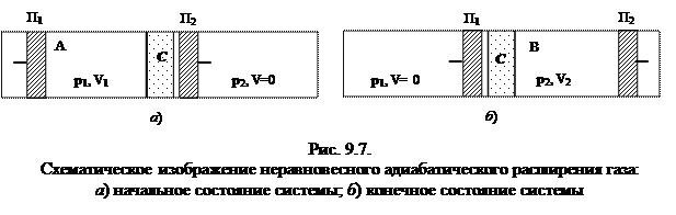 В случае медленно протекающего адиабатического расширения реального газа при изменении давления от р1 до р2 происходит изменение температуры. Это явление получило название эффекта Джоуля-Томсона, а сам процесс – процессом Джоуля – Томсона. На рисунке 9.7. изображена схема неравновесного расширения газа в адиабатических условиях (Q=0). В середине цилиндра, помещенного в адиабатическую оболочку, находится пористая перегородка С, препятствующая быстрому прохождению газа. Из части А поршнем П1 через перегородку под давлением р1 продавливается газ, в результате чего объем газа изменяется от V1 до нуля. При этом в части В перемещается поршень П2 и объем газа при постоянном давлении изменяется от нуля до V2. Так как давление р1 и р2 постоянны, то в части А газ совершает работу