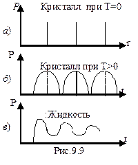 Выделим в нем произвольное направление и построим график зависимости вероятности Р нахождения молекулы газа на некотором расстоянии от другой молекулы, помещенной в начале координат (рис. 9.9. а), при этом молекулы находятся в узлах кристаллической решетки. При более высокой температуре (рис.9.9, б) молекулы колеблются вокруг неподвижных положений равновесия, вблизи которых и проводят большую часть времени. Строгая периодичность повторения максимумов вероятности в идеальном кристалле распространяется сколь угодно далеко от выбранной частицы; поэтому принято говорить, что в твердом теле существует «дальний порядок». В случае жидкости (рис.9.9, в) вблизи каждой молекулы ее соседки расположены более или менее закономерно, но вдали этот порядок нарушается (ближний порядок). На графике расстояния измерены в долях радиуса молекулы (r/r0). 3. Термодинамическая модель. В этой теории вводят величину - радиальная функция распределения - представляющая собой вероятность обнаружить некоторую пару атомов на расстоянии от R до R+dR