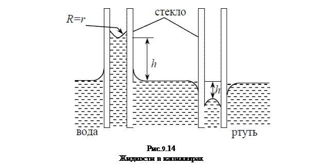 Смачивающая жидкость (q<p/2, cos q>0) поднимается по капилляру(рис.9.14 - вода), и эта формула дает положительное значение h, а несмачивающая жидкость (q>p/2, cos q<0) опускается по капилляру(рис.9.14 - ртуть), и формула дает отрицательные значения h. Из полученного выражения видно, что высота поднятия (опускания) жидкости в капилляре обратно пропорциональна его радиусу. В тонких капиллярах жидкость поднимается достаточно высоко. Рассмотрим поднятие смачивающей жидкости между двумя пластинами, разделенными узким зазором d. Если пластины параллельны, то мениск имеет цилиндрическую форму. Высота капиллярного подъема в этом случае также определяется из условия равенства лапласовского Δр и гидростатического давлений. Для цилиндрической поверхности R1=R - радиус цилиндра, R2=Ґ, поэтому избыточное давление за счет искривления поверхности: