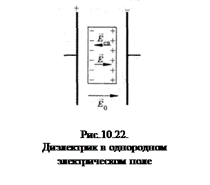 Единицей поляризованности является кулон на квадратный метр (Кл/м2). При поляризации диэлектрика на одной его поверхности (грани) создаются положительные заряды, а на другой – отрицательные (рис 10.20, б и 10. 21, б). Эти электрические заряды называют связанными, так как они принадлежат молекулам диэлектрика и не могут перемещаться отдельно от молекулы или быть удалены с поверхности диэлектрика в отличие от свободных зарядов, которых в идеальном диэлектрике нет. Рассмотрим электрическое поле между пластинами конденсатора, которое характеризуется напряженностью