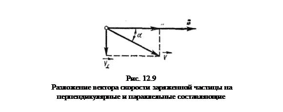 Рассмотрим теперь общий случай движения заряженной частицы в однородном магнитном поле, когда ее скорость υ направлена под произвольным острым углом α к вектору индукции В поля (рис. 12.9). Разложим вектор скорости v на две составляющие — параллельную вектору В (v┴) и перпендикулярную ему (v║): v║ = v· cos α, v┴ = v ·sin α.