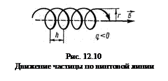 Таким образом, частица одновременно участвует в двух движениях: она равномерно вращается со скоростью v┴ по окружности радиуса r и движется поступательно c постоянной скоростью v║ в направлении, перпендикулярном плоскости вращения. Поэтому траектория заряженной частицы представляет собой винтовую линию, ось которой совпадает с линией индукции магнитного поля (рис.12.10). Расстояние между соседними витками называется шагом винтовой линии