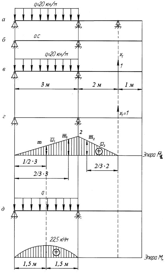 Рис. 1.12. 2. Выбираем основную систему. В нашем случае за лишнюю неизвестную может быть принята любая из реакций RA, RB или RC. В первых двух вариантах определение лишней неизвестной будет производиться перемножением эпюр моментов, построенных на двух пролётах балки. В последнем варианте Х 1 =RC; эпюра моментов от нагрузки 3. Определяем лишнюю неизвестную. Определение лишней неизвестной Х 1 начинают с вычисления коэффициентов уравнения (1.7) по формуле (1.5). Для определения перемещения