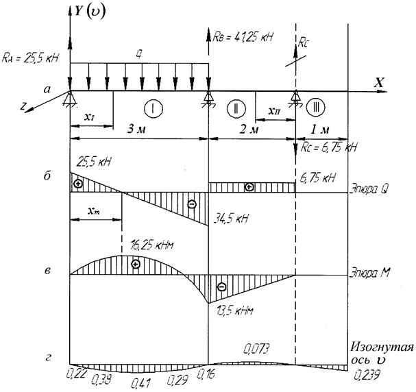 Принимаем двутавр № 14; Wz =81,7 см 3, Jz =572 см 4. 7. Для подбора сечения балки из условия жёсткости определяем максимальный прогиб балки. Полагаем, что он будет в том сечении, в котором возникает максимальный изгибающий момент. Прогиб в любом сечении балки определяем методом начальных параметров из выражения (1.1) для нашей балки. Значение