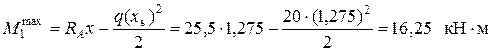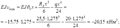 Отрицательное значение угла наклона показывает, что изогнутая ось балки повернута по часовой стрелке. Максимальный прогиб балки при x= 1,275 м определяется по уравнению изогнутой оси (1.13)