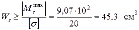 7. Подбираем сечение стержней рамы из условия прочности по нормальным изгибным напряжениям, опасное сечение на участке ВС, где