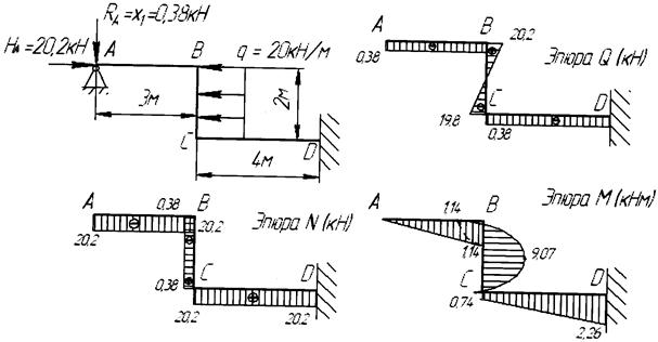 6. Загружаем основную систему внешней нагрузкой и вычисленными реакциями Х1 и Х2 истроим эпюры N, Q и М (рис. 1.16), рассмотренными ранее способами. Анализ эпюры Q показывает, что на участке ВС находится особенная точка, в которой Q = 0. Следовательно, на эпюре внутренних изгибающих моментов будет экстремум. Определяем это экстремальное значение. Для этого изображаем отдельно участок рамы ВС, полагая в точке С опору в виде жесткой заделки. Все нагрузки, приложенные на участке АВ, приводим к точке В. Таким образом все условия статики сохранены. Находим расстояние “ m ” из условия равенства нулю Q в точке M (рис. 1.16).