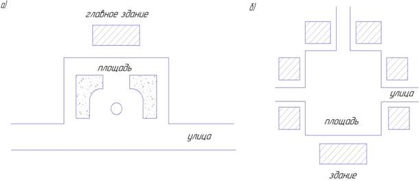 Рис 6. Композиционное решение площади общественного центра: а) главное здание с площадью перед ним; б) площадь, окаймленная общественными зданиями