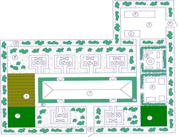 Рис. 14. Планировка участка при детском саде: 1 – здание детского сада; 2 – площадки для игр; 3 – хозяйственная площадка; 4 – мусоросборник; 5 – хозяйственная постройка; 6 – зооуголок; 7 – сад; 8 – площадка для отдыха взрослых; 9 – огород; 10 – вход; 11 – въезд; 12 – ограждение участка рядовой посадкой деревьев; 13 – газон и клумбы; 14 – дорожки и проезды; 15 – озеленение участка