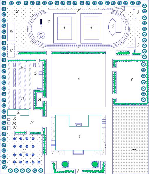 Рис. 15. Планировка участка при школе: 1 – здание школы; 2 – вход на участок; 3 – класс на воздухе; 4 – площадка для массовых игр; 5 – площадка для волейбола; 6 – площадка для прыжков; 7 – гимнастические снаряды; 8 – беговая дорожка; 9 – площадка для игр детей младших классов; 10 – теневой навес; 11 – душ; 12 – площадка для разминки; 13 – учебный огород; 14 – опытный огород; 15 – пункт водоснабжения; 16 – зооуголок; 17 – хозяйственный двор; 18 – хозяйственный сарай; 19 – компостная яма; 20 – мусоросборник; 21 – уличная уборная; 22 – фруктовый сад