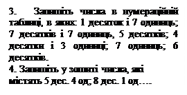 5. Запишіть у зошиті числа: двадцять вісім, п’ятнадцять, сорок три… Засвоєнню нумерації двоцифрових чисел сприяють вправи: 1) поясніть, що означає кожна цифра в запису числа (наприклад: в числі „47” цифра „7” означає кількість одиниць, а цифра „4” – кількість десятків); 2) запишіть за допомогою даних цифр можливі двоцифрові числа (наприклад, з цифр „2” та „5” можна скласти такі двоцифрові числа: 22, 25, 52, 55); 3) дайте характеристику числу: десятковий склад, місце в натуральному ряду, особливості запису (наприклад, число 43 містить 4 десятки та 3 одиниці; попереднє до нього число 42, а наступне – 44; це двоцифрове число записується за допомогою двох різних цифр 4 та 3). Запис числа у вигляді суми розрядних доданків. Після того, як діти навчаться визначати десятковий склад та записувати двоцифрові числа, вводиться поняття „сума розрядних доданків”, як така сума, в якій десятки та одиниці подано окремо, інакше кажучи, це сума десятків та одиниць. Щоб подати число у вигляді суми розрядних доданків, треба: 1) визначити кількість десятків (підкреслити десятки в запису числа двома рисками); 2) визначити кількість одиниць (підкреслити одиниці однією рискою); 3) записати десятки у вигляді круглого числа; 4) до круглого числа додати одиниці. Наприклад: 7 4 = 70 + 4 Способи порівняння чисел: 1. На підставі порядку прямування чисел в натуральному ряду: число, яке при лічбі називається пізніше, – більше, а число, що при лічбі називається раніше, – менше. З цим способом порівняння діти вже добре знайомі: ознайомлення з ним відбулося при вивченні порівняння чисел першого десятка, а закріплення – при вивченні порівняння чисел до 20-ти. Тому, на етапі актуалізації слід повторити, як треба міркувати при порівнянні чисел другого десятка; а потім запитати учнів “Чи можна так само міркувати при порівнянні чисел першої сотні?”. Отримавши від учнів позитивну відповідь, перенести цей спосіб порівняння в нову ситуацію. 2. Порозрядне порівняння чисел починається з найвищого розряду і відбувається за алгоритмом: 1) підкреслюю число десятків у кожному числі; 2) порівнюю числа десятків: більше те число, в якому десятків більше (менше те число, в якому десятків менше); якщо десятків порівну, то переходжу до п. 3); 3) підкреслюю число одиниць у кожному числі; 4) порівнюю числа одиниць: більше те число, в якому одиниць більше (менше те число, в якому одиниць менше); якщо одиниць порівну, то ці числа рівні. Наприклад. Треба порівняти 27 і 19; в числі „27” – 2 десятки, а в числі „19” – 1 десяток; порівнюємо числа десятків: 2 десятки більше 1-го десятка, тому число „27” більше „19”. Треба порівняти „30” і „32”; в числі „30” – 3 десятки, в числі „32” – 3 десятка; порівнюємо числа десятків – порівну, тому переходимо до одиниць; в числі „30” – 0 одиниць, в числі „32” – 2 одиниці; порівнюємо одиниці – 0 менше 2-х, тому число „30” менше числа „32”... Це новий спосіб порівняння. Він буде широко застосовуватися при порівнянні чисел у всіх подальших концентрах, тому йому слід приділити певну увагу.