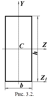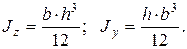 Центральные оси, относительно которых центробежный момент инерции равен нулю – называются главными центральными осями. Признак главных центральных осей – если две взаимно перпендикулярные оси проходят через центр тяжести сечения и при этом хотя бы одна из них является осью симметрии сечения, то эта пара осей главная. Ниже приведена формула для определения моментов инерции относительно главных осей прямоугольника. С – центр тяжести сечения, оси z и y – главные оси инерции сечения. Формулы для определения моментов инерции записываем без вывода: