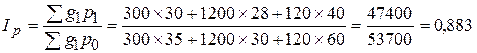 Агрегатным индексом называется индекс, который характеризует изменение совокупности в целом. Например, изменение объёма производства или продажи продуктов, уровней цен, себестоимости, производительности труда и т. д. в отношении совокупности ряда продуктов. При определении агрегатных индексов возникает проблема соизмерения показателей по отдельным видам продуктов. Так, например, нельзя суммировать производство стали, молока, мяса и овощей, нельзя суммировать цену одного метра ткани и одного килограмма яблок или сахара. Проблема несоизмеримости решается путём взвешивания, суть последнего при расчёте общих индексов состоит в том, что абстрагируются от влияния изменения одной из сторон изучаемого явления, принимая её за неизменную величину. В статистике такая сторона явления, от влияния изменения которой отвлекаются, принимая её за неизменную, называется весами. Когда индексируются натуральные (объёмные) показатели, в качестве весов необходимо брать качественные показатели, а когда индексируются качественные в качестве весов необходимо брать натуральные показатели. Так, в индексах объёма производства (товарооборота) индексируются натуральные количества (g) произведённой (проданной) продукции, в качестве весов берутся цены (Р), а полученные произведения образуют стоимости (P× g) отдельных видов произведённой (проданной) продукции. В индексах цен индексируются цены, в качестве весов берутся натуральные количества произведённой продукции, а полученные произведения дают стоимости отдельных видов продукции и т. д. и т.п. Индексы объёмных показателей рассчитываются по весам базисного периода, а индексы качественных показателей (цен, урожайности, себестоимости и т. д.) – по весам (объёму продукции) отчётного периода. Сводным (общим) индексом называют относительный показатель, который характеризует изменения сложного явления, состоящего из элементов, не поддающихся непосредственному суммированию. Например, изменения уровня цен на различные виды товаров. Сводные индексы бывают: тотальными, которые охватывают всю совокупность изучаемых явлений и групповыми, которые охватывают только часть элементов совокупности. Формула индекса физического объёма продукции имеет вид: