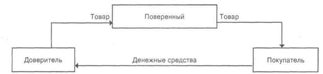 Договор поручения на сбыт товаров На прибретение товаров На практике возможны ситуации, когда между доверителем и поверенным заключается договор поручения на сбыт товаров (когда и товар, и денежные средства проходят через посредника). В данном случае (в отличие от договора комиссии, когда комиссионер, реа- лизуя товар комитента, выступает перед покупателем от своего имени) при принятии денежных средств от покупателя товара в обязательном порядке должно указываться, что поверенный, принимая денежные средства от покупателя товара, выступает не от своего имени, а от имени доверителя.