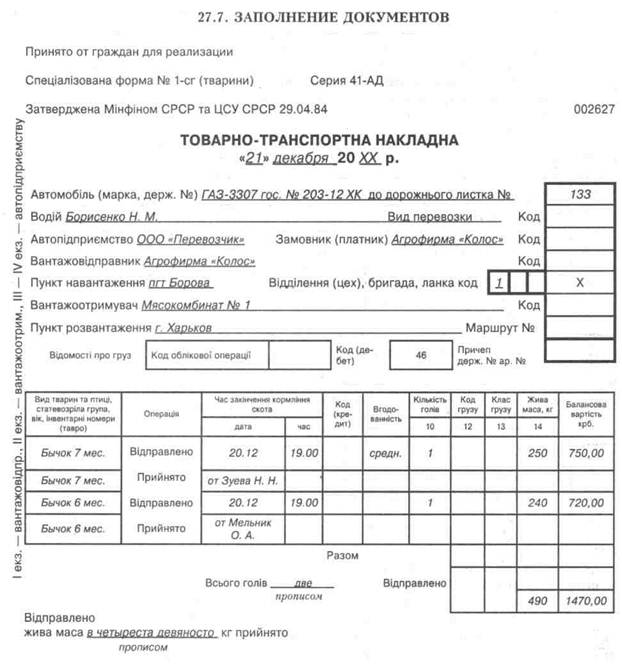 Рисунок 27.3. Образец заполнения товарно-транспортной накладной