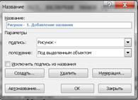 3) В списке Подпись выберите наиболее подходящую подпись для объекта, например "Рисунок" или "Формула". Если в списке нет подходящей подписи, нажмите кнопку Создать, введите новую подпись в поле Название. Например: 4) Введите любой текст, включая знаки препинания, который должен отображаться после подписи.