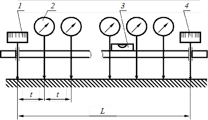 Измерительной головкой, закрепленной в стойке или штативе, или с помощью концевых мер длины измеряют расстояние между профилем детали и линейкой в отдельных точках через шаг t (см. табл. 12.4) и строят профилограмму. Отклонение от прямолинейности оценивают по профилограмме. Вместо линейки может быть использована поверочная плита. Измерение несколькими измерительными головками. В простейшем случае измерительное средство компаратор состоит из двух неподвижных опор, корпуса и нескольких измерительных головок, расположенных с шагом t. Установка головок на ноль производится по мере прямолинейности. По показаниям головок после установки компаратора на измеряемую деталь строится профилограмма, в опорных точках отклонения принимаются равными нулю. Компаратор с регулируемыми опорами 1 и 4 и уровнем 3 (рис. 12.5) применяется для измерения изделий превышающих длину компаратора. Компаратор последовательно устанавливают на нескольких участках измеряемого профиля, так чтобы каждый последующий участок включал хотя бы одну точку предыдущего. Настройка компаратора и снятие отсчетов с измерительных головок и шкал регулируемых опор производится при нулевом показании уровня.