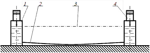 Гидростатические уровни 1 и 4 устанавливают на измеряемой поверхности. Один из них (или уравнительный сосуд) занимает постоянное положение, а другой перемещается шагами в другие точки измерения. Уровень жидкости 3 остается постоянным. Каждый раз фиксируется изменение показаний неподвижного и подвижного уровней. Если уровни одинаковые, то смещение по высоте измеряемой точки относительно начальной равно половине разности показаний уровней. При применении уравнительного сосуда смещение точки по высоте равно изменению показаний перемещаемого уровня. По измеренным высотам строится профилиграмма. Отклонение от прямолинейности определяется по профилограмме. Измерение изменений наклонов отдельных участков профиля. Измерение производится шаговым методом с помощью двухопорного мостика с расстоянием между опорами равным шагу t. Мостик перемещается шагами t вдоль измеряемого профиля. Измерение изменений наклона отдельных участков может производиться различными способами.