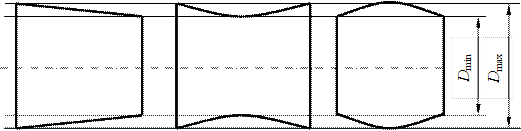 Другой характеристикой формы цилиндрической поверхности является профиль продольного сечения цилиндрической поверхности. Частными случаями отклонения от профиля продольного сечения являются: бочкообразность, седлообразность и конусность (рис. 12.17). В этих случаях необходимо измерить диаметр цилиндра в трех сечениях двух крайних и посередине и взять разность максимального и минимального значения размера.