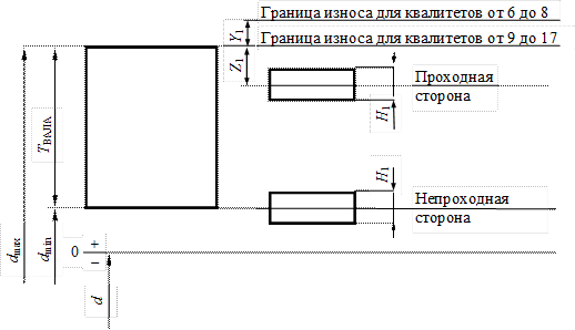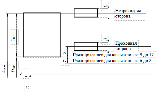 Контроль размеров отверстий и валов 6–17 квалитетов обычно осуществляется рабочими предельными калибрами. Номинальные размеры этих калибров соответствуют предельным размерам контролируемых деталей. Контроль размеров отверстий осуществляется калибрами – пробками, валов – калибрами-скобами. У калибра-пробки одна сторона (удлиненная), номинальный размер которой соответствует наименьшему предельному размеру отверстия, называется проходной (ПР), другая, номинальный размер которой соответствует наибольшему предельному размеру отверстия, называется непроходной (НЕ).