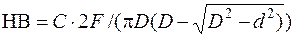 Твердость – сопротивление материала внедрению в его поверхность стандартного наконечника, который представляет собой твердое малодеформирующееся тело определенной формы и размеров. Для измерения твердости предложено много методов. Основными являются методы вдавливания наконечников в материал под действием статической нагрузки. Значение твердости металлов, измеренное различными методами, выражается числами твердости в различных шкалах (Бринелля, Виккерса, Роквелла, Шора). Сущность метода Бринелля заключается во вдавливании стального шарика диаметром D под действием силы F, приложенной перпендикулярно к поверхности образца, в течение определенного времени и в измерении диаметра d отпечатка после снятия нагрузки. Твердость по шкале Бринелля НВ это отношение силы F к площади сферического отпечатка. Число твердости находят с помощью специальных таблиц по значениям D, d и F или вычисляются по формуле: