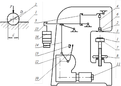На приборе ТШ-2М (рис. 16.1) для измерения твердости металлов по шкале Бринелля проверяемый образец устанавливают на стол 7 и вращением маховика 8 поднимают к шариковому наконечнику 2 до упора в ограничитель 5. Затем нажимают пусковую кнопку и включают привод 11. Кривошип 12, поворачиваясь, опускает шатун 14 и освобождает рычажную систему 3, на конце которой закреплена подвеска 15 со съемными грузами 16. Груз давит на шпиндель 4 и шариковая оправка 6 внедряется в образец 1. Кривошип 12 поворачивается до тех пор, пока упор 10 не коснется микропереключателя 13 и не изменит вращение привода на обратное. Затем рычажная система возвращается в исходное положение. После испытания стол опускают и измеряют диаметр отпечатка. Сущность метода Роквелла заключается во вдавливании в поверхность образца наконечника стандартного типа и в изменении глубины его проникновения в металл. Наконечник вдавливается в два последовательных приема: сначала на него действует предварительная сила F 0 = 98 Н, затем к нему прикладывают дополнительную силу F 1. Твердость по шкале Роквелла НR это разность между условной глубиной внедрения и глубиной проникновения L наконечника после снятия дополнительной силы при сохранении предварительной силы F 0. В зависимости от типа наконечника и значения силы F 1 твердость по методу Роквелла измеряется по трем шкалам А, В. и С и обозначается числом твердости и буквами, указывающими шкалу. Например, 60 HRCЭ. Зависимость между числом твердости и значением L в мм дана в табл. 16.1.