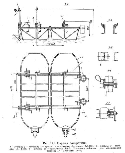 В состав парома входят две лодки, два подвесных лодочных мотора с приспособлениями и для навески, два телескопических прогона, механизм подъема и развертывания рамных опор и механизм подъема пролетного строения. Телескопические прогоны соединяют лодки в паром и обеспечивают строительство моста с пролетом 4—4,5 м. Прогоны опираются на борта лодок и крепятся к ним винтами. Механизм подъема и развертывания рамных опор включает два шаблона с цепными захватами для крепления за стойки опоры, две стойки с роликами для направления канатов, две двухбарабанные лебедки (грузоподъемностью 0,5 т) с тяговыми канатами для подъема и установки в вертикальное положение рамных опор. Механизм подъема пролетного строения предназначен для подъема и опускания пролетного строения на возведенные опоры. Механизм включает четыре винтовых домкрата и два ригеля. Подъем головки домкрата производят вращением его рукоятки по ходу часовой стрелки. Домкраты обеспечивают опускание ригелей с уложенным на них пролетным строением с высоты 1,9 до 1.1 м над водой при осадке парома не более 0,3 м. Для производства работ по укладке пролетного строения при строительстве мостов на свайных опорах механизм подъема и развертывания рамных опор на пароме не устанавливается. При технических обслуживаниях № 1 и 2 необходимо обслужить подвесные лодочные моторы и смазать смазкой Литол-24 валы и шестерни двухбарабанных лебедок, резьбы винтов и оси прогонов, подшипники, винты и шестерни домкратов; смазать маслом ТАП-15В запорные кулачки домкратов, болты и шины стоек с роликами, смазкой канатной 39У—тяговые канаты двухбарабанных лебедок.