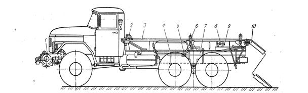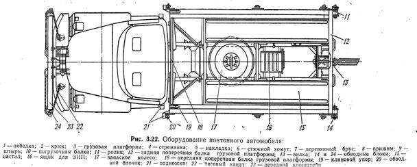 Т р а н с п о р т н ы е с р е д с т в а. Транспортные средства комплекта КМС-Э включают: три понтонных автомобиля ЗИЛ-1З1 со специальными платформами для перевозки сваебойно-обстроечного парома; бортовой автомобиль 3ил-131 для перевозки парома с домкратами, вспомогательной лодки и остального имущества. Понтонный автомобиль имеет доработанную табельную лебедку с двумя тяговыми канатами, кронштейн с обводными блоками, грузовую платформу с оборудованием, погрузочную балку и ящик для ЗИП. Понтон с копровым блоком или блок понтонов с обстроечным оборудованием перевозится на грузовой платформе и закрепляется на ней стяжными хомутами. При технических обслуживаниях № 1 и 2 необходимо смазать смазкой Ли-тол-24 оси обводных блоков и роликов кронштейна и платформы, резьбы и головки болтов стяжных хомутов, смазкой канатной 39У—тяговые канаты лебедки.
