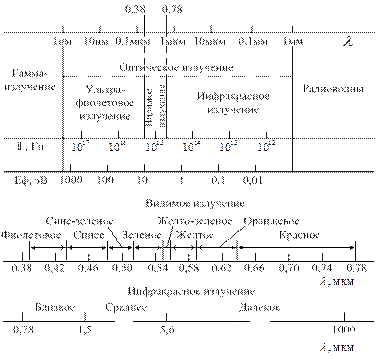 Любое устройство квантовой и оптической электроники в подавляющем большинстве случаев содержит источник излучения, приёмник излучения и, если это необходимо, своего рода линию связи между ними для «транспортировки» излучения от источника к приемнику. Излучение любого источника с достаточной полнотой может быть охарактеризовано, если известны: ▪ интегральная мощность излучения; ▪ пространственная диаграмма его направленности; ▪ спектральный состав. В ХVΙΙΙ – ХΙХ веках в качестве приемника излучения использовался человеческий глаз, и светом называли тот участок спектра электромагнитного излучения (380 – 780нм), который воспринимается человеческим зрением. Соответственно характеристики и параметры для этого диапазона называют фотометрическими (или световыми) - от гр. photos (фотос) – свет. Их получали в результате усреднения субъективных оценок восприятия группой людей ЭМИ оптического диапазона вышеупомянутого участка длин волн, который доступен человеческому зрению. Если же оценивать ЭМИ безотносительно приемника излучения, то предпочтительнее использовать энергетические характеристики и параметры, которые являются объективными, а не субъективными, как фотометрические, и могут использоваться для всего диапазона длин волн или частот (спектрального диапазона) ЭМИ. Этот диапазон простирается от одного нанометра до одного миллиметра и носит название оптического диапазона ЭМИ. Шкала ЭМИ оптического диапазона приведена на рис. 1.