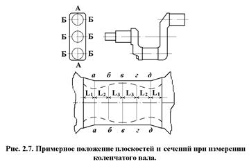 5.1. Порядок замера и обработки результатов. Для получения размеров коренных и шатунных шеек коленчатого вала двигателя используют микрометры гладкие с ценой деления 0,01мм. Измерение шатунных и коренных шеек коленчатого вала производится во взаимно перпендикулярных плоскостях (А - А и Б - Б) и в каждой плоскости в трёх сечениях по длине шейки (рис. 2.7.).