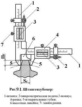 Приборы для контроля зубчатых колес Зубомеры Зубомеры предназначены для измерения элементов зубьев, определяющих боковой зазор в зацеплении. Зубомеры делятся на накладные и станковые. На производстве в основном применяются два типа накладных зубомеров для цилиндрических зубчатых колес: штангензубомер (рис.9.1) и тангенциальный зубомер (рис.9.2) для определения положения исходного контура относительного наружного диаметра.