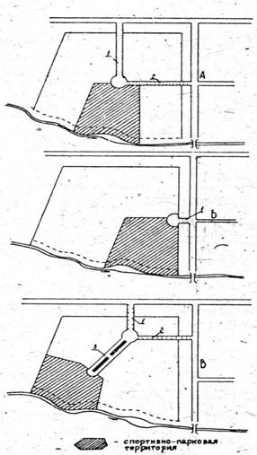 Рис.4. Варианты размещения площади общественного центра, спортивно-парковой территории и трассирование главных улиц: 1. Улица въезда с зелеными насаждениями с обеих сторон проезжей части. 2. Улица, связывающая площадь общественного центра с производственной зоной. Зеленые насаждения - также с обеих сторон проезжей части. 3.Улица с бульваром, связывающая площадь общественного центра со спортивно-парковой территорией