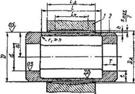 Рис. 3.11. Тонкостенная втулка. Исходными данными для расчета тонкостенных втулок являются диаметр Dd отверстия или диаметр шейки обрабатываемой детали и длина 1д отверстия или шейки обрабатываемой детали. Для расчета тонкостенной самоцентрирующей втулки (рис. 3.11) примем следующие обозначения: D — диаметр установочной поверхности центрирующей втулки 2, мм; h — толщина тонкостенной части втулки, мм; Г — длина опорных поясков втулки, мм; t — толщина опорных поясков втулки, мм; DDдоп— наибольшая диаметральная упругая деформация втулки (увеличение или уменьшение диаметра в ее средней части) мм; Smax — максимальный зазор между установочной поверхностью втулки и базовой поверхностью обрабатываемой детали 1 в свободном состоянии, мм; lК — длина контактного участка упругой втулки с установочной поверхностью обрабатываемой детали после разжима втулки, мм; L —длина тонкостенной части втулки, мм; lд — длина обрабатываемой детали, мм; Dd — диаметр базовой поверхности обрабатываемой детали, мм; d — диаметр отверстия опорных поясков втулки, мм; р _ давление гидропластмассы, требуемое для деформации тонкостенной втулки, МПа (кгс/см2); r1, — радиус закругления втулки, мм; Mpeз=Pzr — допустимый крутящий момент, возникающий от силы резания, Н-м (кгс-см); Pz — сила резания, Н (кгс); r —плечо момента силы резания. На рис. 3.12 показана консольная оправка с тонкостенной втулкой и гидропластмассой. Обрабатываемую деталь 4 базовым отверстием устанавливают на наружную поверхность тонкостенной втулки 5. При подаче сжатого воздуха в штоковую полость пневмоцилиндра поршень со штоком перемещается в пневмоцилиндре влево и шток через тягу 6 и рычаг 1 передвигает плунжер 2, который нажимает на гидропластмассу 3. Гидропластмасса равномерно давит на внутреннюю поверхность втулки 5, втулка разжимается; наружный диаметр втулки увеличивается, и она центрирует и закрепляет обрабатываемую деталь 4. Мембранные патроны применяют для точного центрирования и зажима деталей, обрабатываемых на токарных и шлифовальных станках. В мембранных патронах