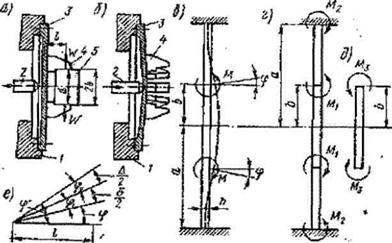 Рис. 3.13. Схема мембранно-рожкового патрона Основные данные для расчета патрона (рис. 3.13, а) с рожковой мембраной: момент резания Мрез, стремящийся повернуть обрабатываемую деталь 5 в кулачках 4 патрона; диаметр d = 2b базовой наружной поверхности обрабатываемой детали; расстояние / от середины мембраны 3 до середины кулачков 4. На рис. 3.13, в дана расчетная схема нагруженной мембраны. Круглая, жестко закрепленная по наружной поверхности мембрана нагружена равномерно распределенным изгибающим моментом Ми, приложенным по концентрической окружности мембраны радиуса b базовой поверхности обрабатываемой детали. Данная схема является результатом наложения двух схем, показанных на рис. 3.13, г, д, причем Ми=М1+М3. На рис. 3.13, в принято: а — радиус наружной поверхности мембраны, см (выбирают по конструктивным условиям); h=0,1-0,07 — толщина мембраны, см; Ми — момент, изгибающий мембрану, Н-м (кгс-мм); j — угол разжима кулачков 4 мембраны, требуемый для установки и зажима обрабатываемой детали с наименьшим предельным размером, град. На рис. 3.13, е показан максимальный угол разжима кулачков мембраны: j/ = j + j1 + j2 где: j1 — дополнительный угол разжима кулачка, учитывающий допуск d. неточность изготовления установочной поверхности детали; j2 — угол разжима кулачков, учитывающий диаметральный зазор D, необходимый для возможности установки деталей в патрон. Из рис. 3.13, е видно, что угол: