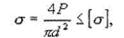 где s — фактическое напряжение растяжения (с жатия), МПа; Р — расчетная осевая сила, Н; d — диаметр опасного сечения (для резьбового стержня — внутренний диаметр резьбы), мм; [s] — допускаемое напряжение растяжения (сжатия), МПа. Определение необходимого размера опасного сечения (задача б) для подобного случая можно производить по формуле