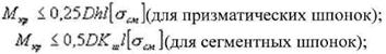 где Р — срезающая сила, Н; d — диаметр штифта (стержня винта), мм; i — число стыков (количество штифтов или винтов) в соединении; [tср]— допускаемое напряжение среза, МПа. Расчет на прочность шпоночных и шлицевых соединений заключается в сравнении фактически передаваемого крутящего момента с допускаемым моментом из условий прочности шпонок (шлиц). Расчет на прочность шпоночных соединений (задача а) производится по формулам: на смятие: