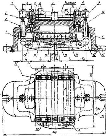 где Мкр — крутящий момент, Н-мм; z — число шлицев; h — высота поверхности контакта (для прямобочного профиля h=0,5*(D - d)-2fш, здесь fш — фаска зуба и паза шпоночного соединения, по СТ СЭВ 188 - 75 фаска принимается равной 0,3...0,5 мм с допуском +0,2... + 0,3; для эвольвентных шлицев с центрированием по боковым поверхностям h = m, с центрированием по наружной цилиндрической поверхности h = 0,9т; D — наружный диаметр вала, мм; d — внутренний диаметр отверстия, мм; b — ширина шлица, мм; т — модуль эвольвентного соединения, мм; y/ — коэффициент, учитывающий неравномерность распределения нагрузки по шлицам (y/ принимается равным 0,7...0,8). При необходимости расчеты на прочность сварных соединений, пружин, подшипников, клиноременных, зубчатых передач и других специфических сборочных единиц и деталей специальных приспособлений следует выполнять с помощью справочных и других литературных источников. Пример.16.1. Рассчитать на прочность опасного звена, приспособления (см. рис. 16.1). Из рассмотрения данного приспособления можно прийти к выводу, что одной из наиболее нагруженных деталей является ось 6 стойки 9. Она воспринимает повышенные нагрузки, связанные с зажимом обрабатываемых заготовок. Направление действия создаваемой пневмоцилиндром силы меняется на противоположное посредством рычагов 13. При этом она увеличивается в несколько раз. Затем через штоки 10 и пяты 3 она передается на рычаг 4, получает направление в сторону зажима заготовок и вновь возрастает. Таким образом, на прочность целесообразно рассчитывать наиболее нагруженное звено (в описанном случае ось б). Ось 6 в отверстиях рычага 4 и стойки 9 установлена с зазором и будет работать на изгиб. В соответствии с принятым решением она изготавливается из стали 20Х с цементацией и закалкой до твердости 57...63 HRC3. Вид нагрузки П (переменная). По табл. П28 напряжение [sиз] для приведенного случая равно 220 МПа. Из силового расчета выявлено, что изгибающий момент УИИЗ, действующий на опасное звено приспособления, равен 10 800 Н-мм. Минимальный диаметр оси можно рассчитать (задача б) по формуле: