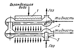 Абсорбция протекает на поверхности раздела фаз. Поэтому абсорберы должны иметь развитую поверхность контакта фаз между газом и жидкостью. По способу образования этой поверхности абсорберы можно разделить на следующие четыре основные группы: поверхностные и пленочные; насадочные, в которых поверхностью контакта фаз является поверхность растекающейся по специальной насадке жидкости; барботажные абсорберы, в которых поверхность контакта фаз создается потоками газа (пара) и жидкости; распыливающие абсорберы, в которых поверхность контакта фаз создается вследствие разбрызгивания жидкости. В поверхностных абсорберах газ пропускается над поверхностью движущейся жидкости. Так как в поверхностных абсорберах поверхность контакта фаз невелика, то устанавливают несколько последовательно соединенных аппаратов, в которых газ и жидкость движутся противотоком друг к другу. На рис. 13.6 показан оросительный абсорбер из горизонтальных труб, внутри которых протекает жидкость, а противотоком к ней движется газ. Уровень жидкости в трубах поддерживается с помощью порога. Охлаждение абсорбера происходит с поверхности орошаемой жидкости.