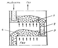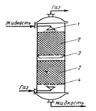 Рис. 13.9. Устройство аппарата с насадкой: 1-распределительное устройство; 2-насадка; 3-устройство для перераспределения жидкости; 4-решетка