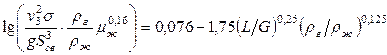 Насадочные колонны работают наиболее эффективно в условиях режима подвисания, близкого к режиму захлебывания, т. е. такого режима, при котором вес находящейся на насадке жидкости становится равным силе трения газового потока о жидкость. В режиме подвисания пленочное течение жидкости нарушается: возникают брызги, различного рода завихрения и т. д. Жидкость заполняет свободный объем насадки, образуя газожидкостную смесь. При этом значительно возрастают по сравнению с пленочным режимом поверхность контакта фаз и коэффициенты массопередачи. Дальнейшее небольшое увеличение скорости газа приводит к захлебыванию колонны. Это явление характеризуется прекращением противоточного движения потоков и выносом жидкости из колонны. Оптимальный режим работы насадочного абсорбера имеет место при скоростях газа, на 15...20% меньших скоростей, вызывающих захлебывание. Скорость газа, при которой происходит захлебывание, может быть определена по формуле, рекомендуемой А. Г. Касаткиным: