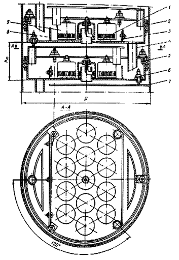На рис. 13.11 изображена колпачковая тарелка с капсульными колпачками и сегментными переливными устройствами. Тарелки представляют собой стальной диск, который крепится на прокладке болтами к опорному кольцу.