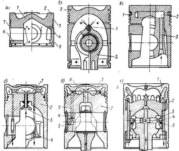 Рис. 3.10. Конструкции и способы охлаждения поршней тронковых двигателей