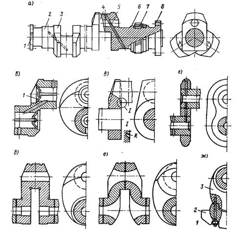 Рис. 3.20. Коленчатый вал: а – общий вид; б – цельный; в – полусоставной; г – составной; д, е – сварной; ж – крепление противовеса