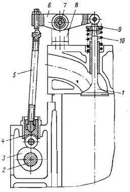 Рис. 4.1. Клапанный механизм газораспределения. Клапанный механизм (рис. 3.4) состоит из клапанов 1 (впускных и выпускных), деталей привода к ним (толкателей 4, штанг 5, рычагов 6), распределительного вала 2 с кулачковыми шайбами 3, клапанных пружин 10 и тарелок 9 пружин. Клапаны подвергаются нагрузке от сил давления газов и инерции и нагреву от горячих газов. Высокая температура и скорость газов, содержащих агрессивные компоненты (соединения серы, ванадия), вызывают коррозию и эрозию посадочных поверхностей клапанов и их седел. Топливная система необходима для подготовки и подачи топлива в цилиндр; состоит из устройств для очистки и подогрева топлива, вискозиметра, насосов высокого давления и подкачивающего, форсунок, топливопроводов низкого и высокого давления. Топливную систему разделяют на топливную систему низкого и высокого давлений. Система низкого давления обеспечивает подготовку (хранение, перекачку, очистку, подогрев топлива) и подачу топлива к системе высокого давления. Система высокого давления. Для организации процесса сгорания топлива топливная система высокого давления дизеля (топливная аппаратура) должна обеспечить: – впрыскивание точно дозированной цикловой подачи топлива; – заданные фазы топливоподачи (начало и конец) и характеристику впрыскивания, благоприятствующие рабочему процессу дизеля на любом его эксплуатационном режиме; – качественное распыливание топлива, т. е, высокое его давление перед распиливающими отверстиями на всех эксплуатационных режимах дизеля, включая малые нагрузки и холостой ход. При эксплуатации главных судовых дизелей необходимо также обеспечить возможность выключения подачи топлива отдельными ТНВД без остановки двигателя в случае выхода из строя какого-либо цилиндра. Данное требование Регистра имеет важное значение, так как может случиться, что остановка главного двигателя приведет к серьезным авариям судна. В зависимости от конструктивной схемы топливные системы высокого давления судовых дизелей разделяют на две группы: системы непосредственного действия и аккумуляторные. В системах непосредственного действия подача топлива насосом высокого давления к форсунке и его впрыскивание форсункой в рабочий цилиндр дизеля происходят во время нагнетательного хода плунжера ТНВД. В аккумуляторных системах впрыскивание топлива осуществляется за счет энергии топлива, аккумулированной до начала впрыскивания в специальном аккумуляторе. Топливные системы непосредственного действия делят на два типа: разделенные и неразделенные. В первом случае ТНВД и форсунка соединены между собой топливопроводом высокого давления, а во втором они объединены в общем корпусе и образуют систему насос-форсунка. В дизелях с прямоточно-клапанной продувкой в которых на каждом цилиндре устанавливают две, три или четыре форсунки, топливные системы высокого давления выполняют разделенно-разветвленного типа, В данном случае насос подает топливо ко всем форсункам, установленным на цилиндре, при этом насос соединен с одним топливопроводом, который в специальной коробке разветвляется на несколько топливопроводов. В некоторых дизелях нашли применение и разветвленные топливные системы высокого давления, когда два насоса подают топливо к одной форсунке. Эти системы перспективны для впрыскивания д
