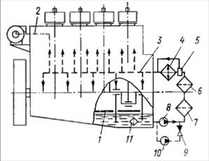 а б Рис. 4.4. Схема смазочной системы: а – с «мокрым» картером; б – с «сухим» картером