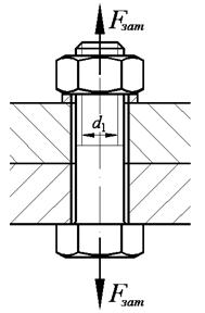 Стержень болта работает на растяжение, поэтому расчет ведется по нормальным напряжениям растяжения. В качестве расчетного сечения принимается самое тонкое сечение стержня болта – по внутреннему диаметру резьбы.