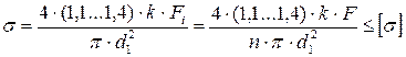 Коэффициент для коротких, достаточно жестких болтов обычно принимают 1,4. В качестве расчетного сечения принимается самое тонкое сечение стержня болта – по внутреннему диаметру резьбы.