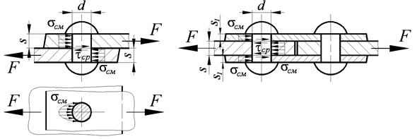 Напряжение смятия действует в двух направлениях. Смятие одинаково действует как на боковую поверхность заклепки, так и на внутреннюю поверхность отверстия детали. Поэтому в качестве допускаемых напряжений на смятие принимаются допускаемые напряжения более слабого материала. Если материал соединяемых деталей одинаков, а толщина разная, то в качестве расчетной площади смятия принимается меньшая площадь, например, если