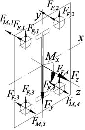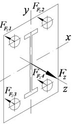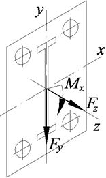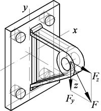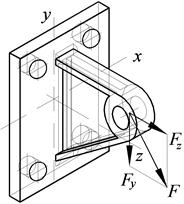 Решение: 1. Кронштейн считаем жестким. Болты крепления кронштейна расположены симметрично, оси x, y, z проходят через центр соединения. Силу F разбиваем на составляющие